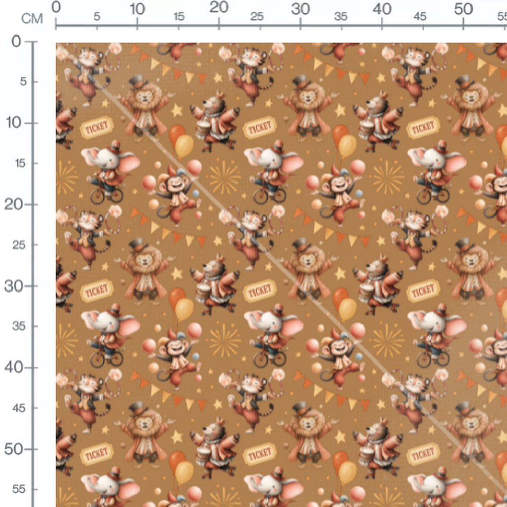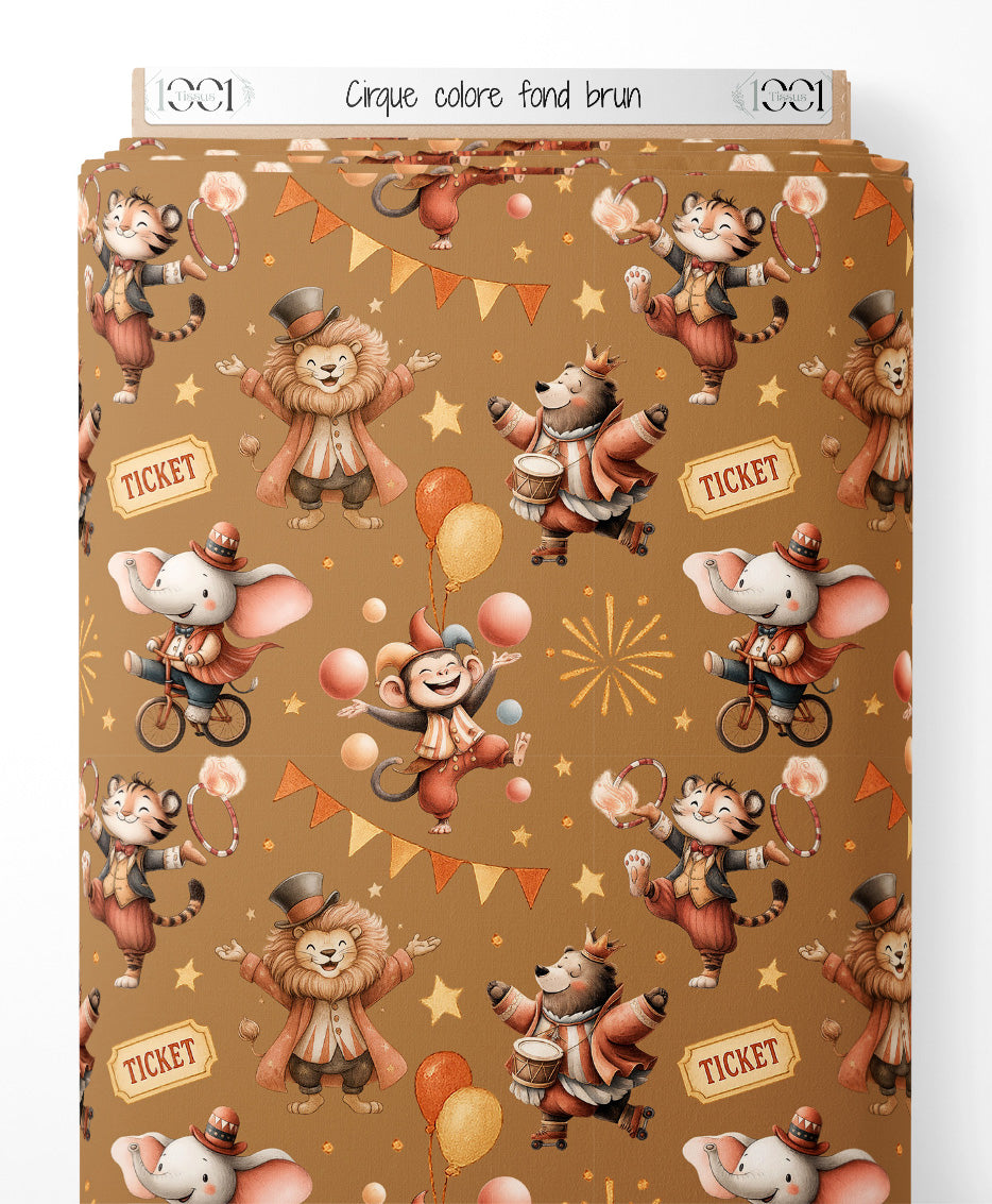 Le tigre jongle avec des cerceaux, tandis que le lion porte un chapeau haut de forme. L'éléphant fait du monocycle et le singe joue avec des ballons. Des étoiles et des feux d'artifice ajoutent une touche festive.Les tissus