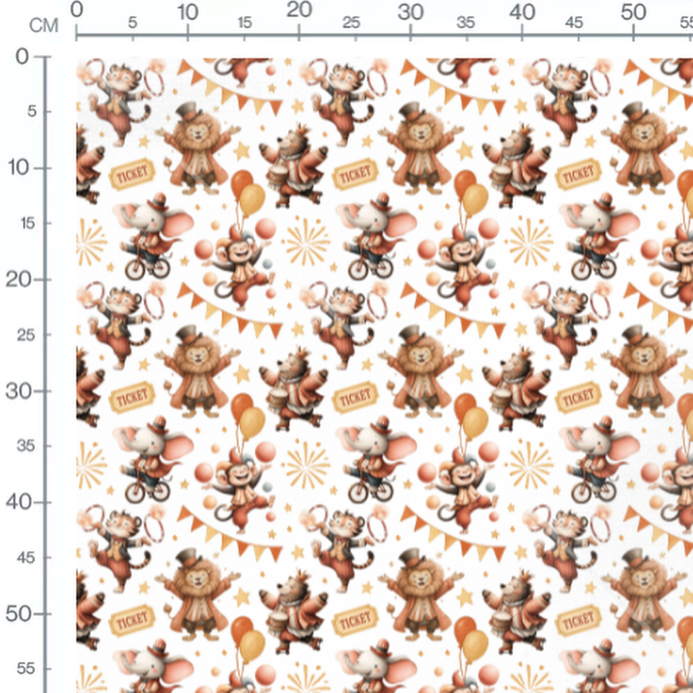 Les animaux portent des chapeaux et des costumes de cirque. Des ballons et des étoiles complètent le motif festif. Les couleurs dominantes sont l'orange, le beige et le brun. Des éléments de cirque comme des tickets et des tambours sont présents.Les tissus