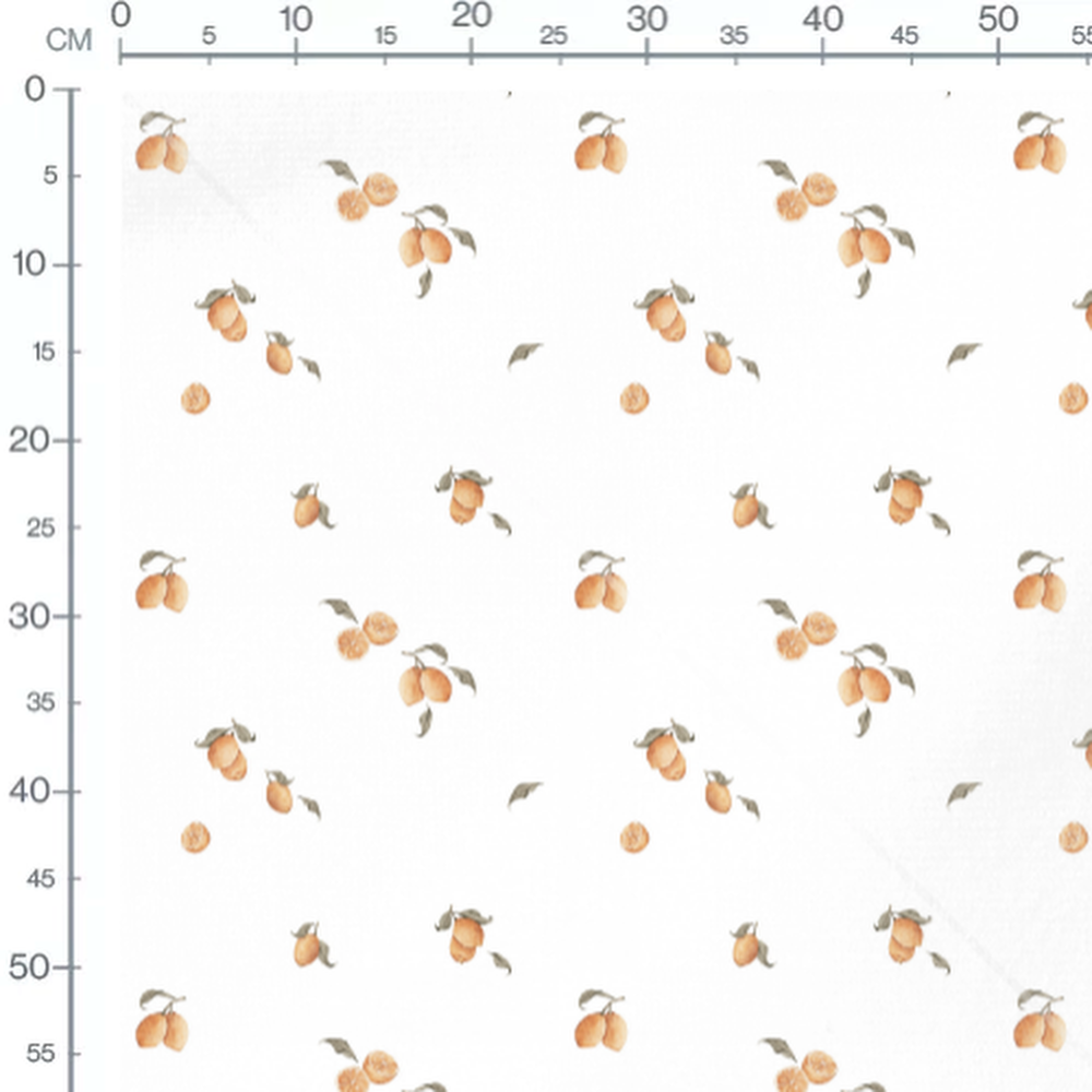 Les citrons sont représentés avec des nuances d'orange et des détails réalistes. Les feuilles vertes ajoutent une touche naturelle au motif. Les tranches de citron montrent l'intérieur juteux. Le fond blanc met en valeur les couleurs des citrons et des feuilles.Les tissus