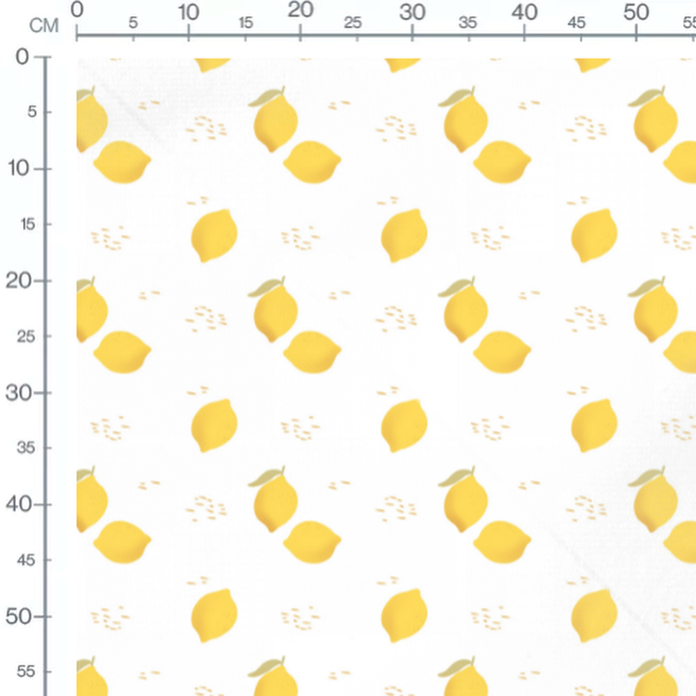 Les citrons sont de couleur jaune vif avec quelques feuilles vertes. Le fond est blanc, mettant en valeur les fruits. De petites graines jaunes sont éparpillées entre les citrons.Les tissus