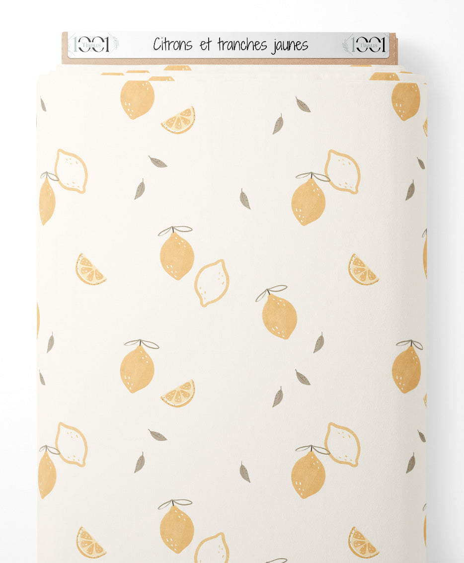 Les citrons sont dessinés avec des contours simples et des détails minimalistes. Les tranches de citron montrent des segments internes. Les feuilles ajoutent une touche de contraste avec leur couleur grise.Les tissus