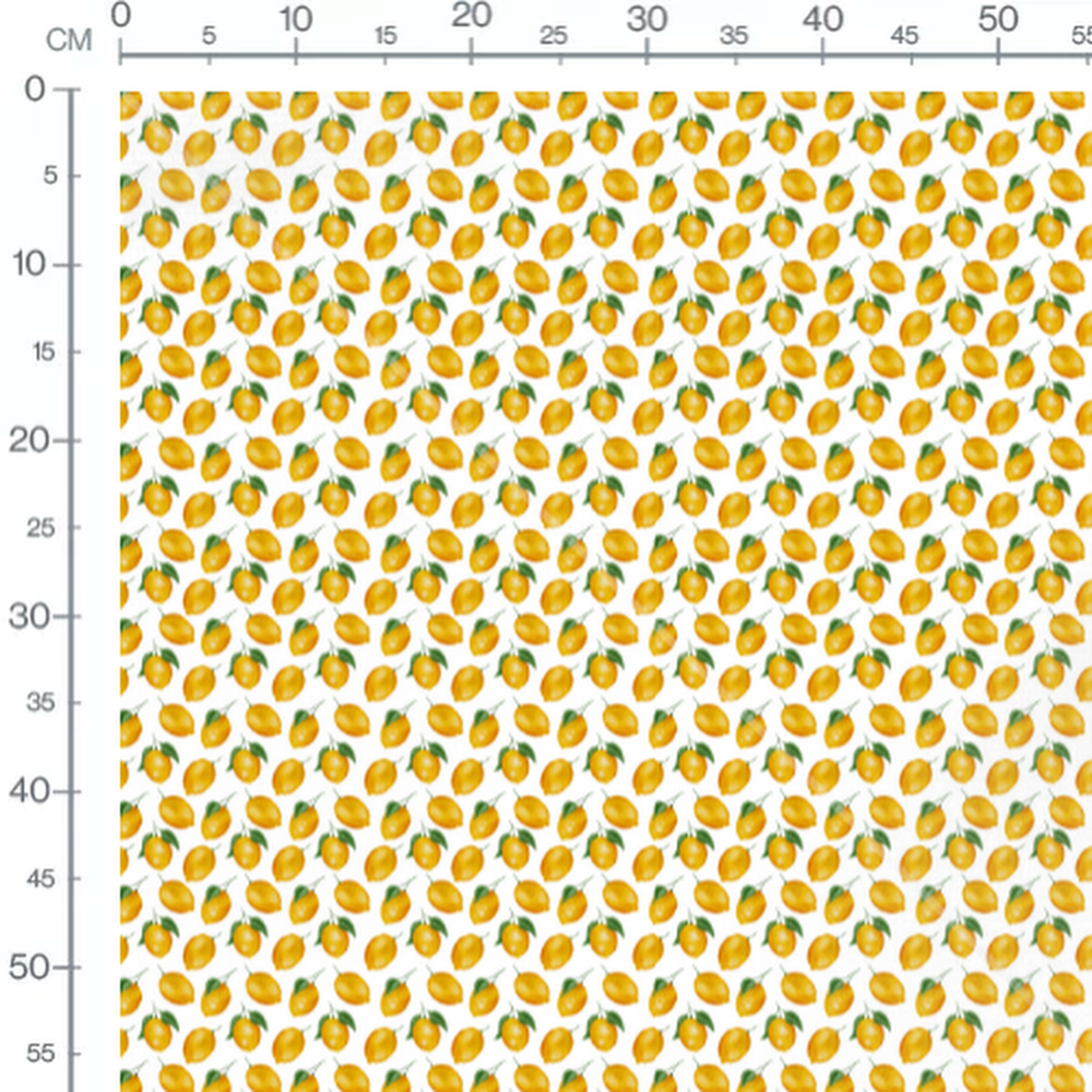 Les citrons sont représentés avec des nuances de jaune vif et des feuilles vertes. Le fond blanc met en valeur les couleurs éclatantes des fruits. Les citrons sont disposés de manière régulière, créant un motif harmonieux.Les tissus
