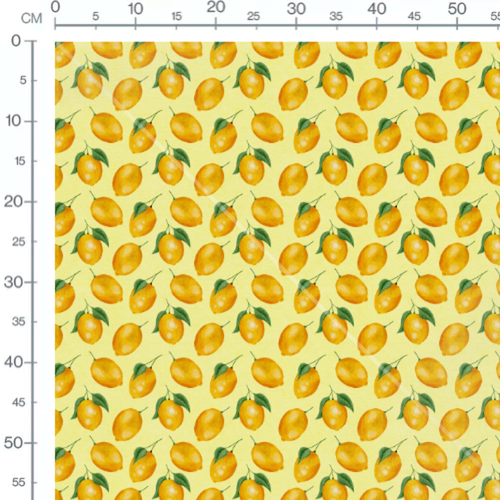 Les citrons sont de couleur jaune vif avec des feuilles vertes. Le fond est d'un jaune clair uniforme. Les fruits sont disposés de manière régulière, créant un motif harmonieux.Les tissus