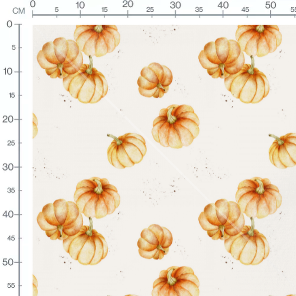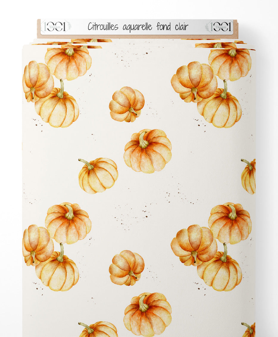 Les citrouilles sont dessinées dans des tons doux d'orange et de beige. Le fond blanc est parsemé de petites taches brunes, ajoutant un effet texturé. Chaque citrouille présente des nuances subtiles, créant un effet aquarelle.Les tissus