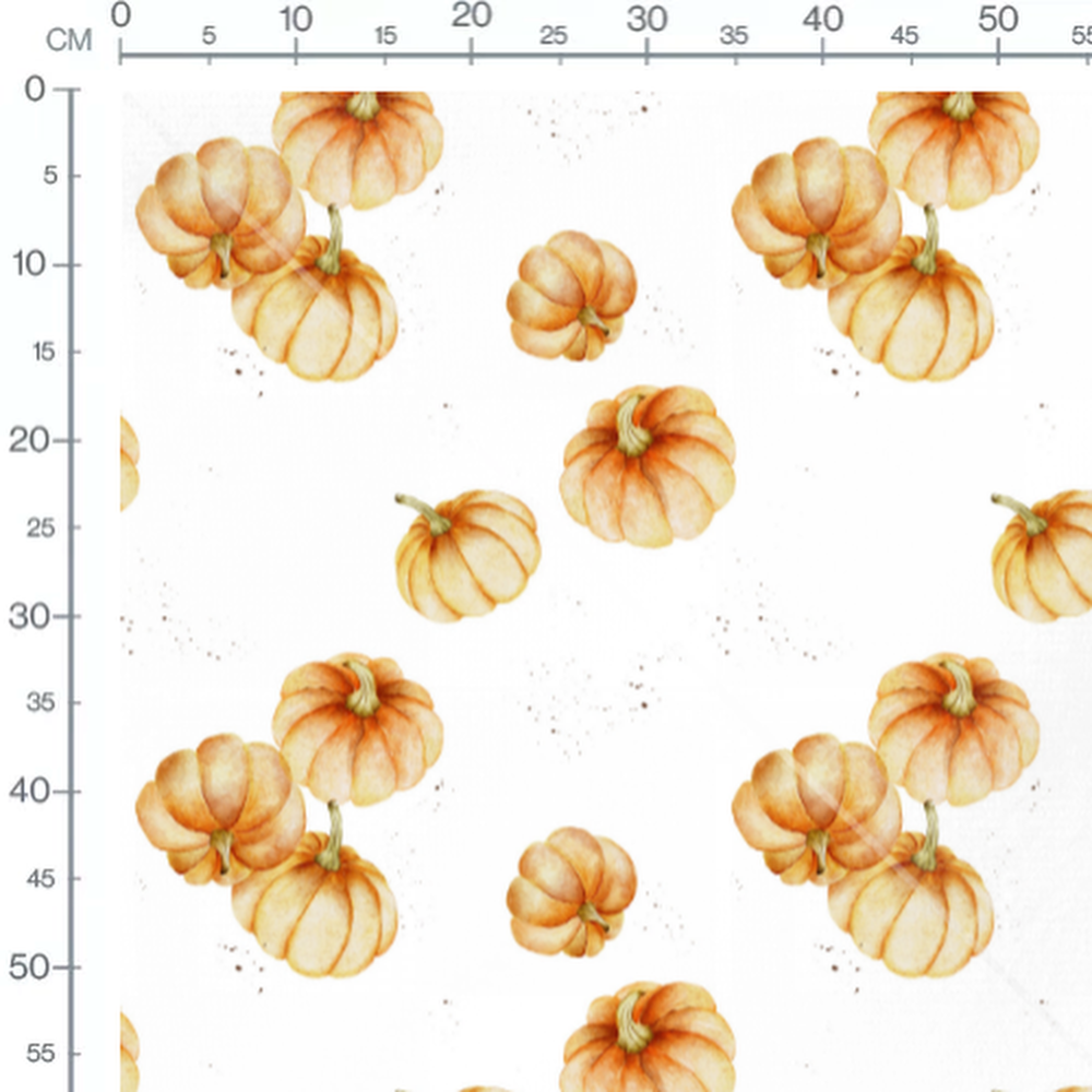 Les citrouilles sont dessinées dans des tons doux d'orange et de beige. Le fond blanc est parsemé de petites taches brunes, ajoutant une touche artistique. Chaque citrouille est unique par sa forme et sa teinte.Les tissus