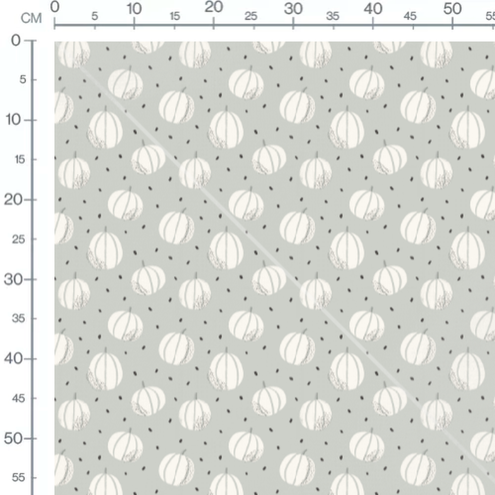Les citrouilles sont décorées de lignes grises et de points noirs. Le fond gris clair met en valeur les motifs noirs et blancs.Les tissus