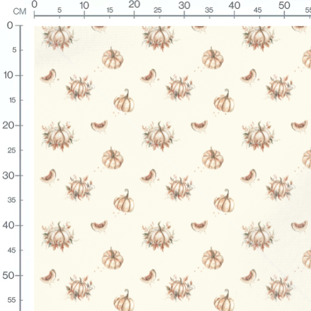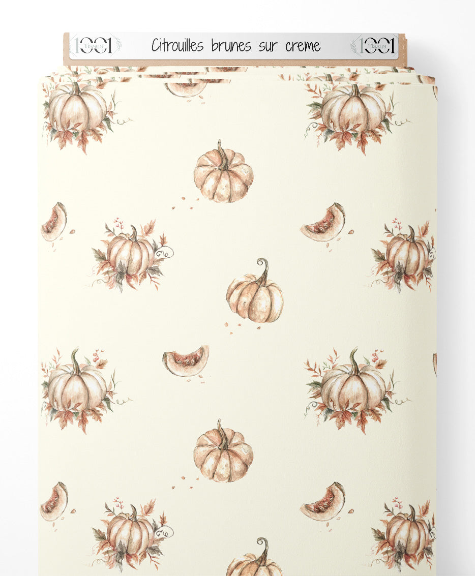 Les citrouilles sont entourées de feuilles aux teintes automnales. Des tranches de citrouille et des petites baies ajoutent des détails subtils. Le fond crème met en valeur les couleurs douces du motif.Les tissus