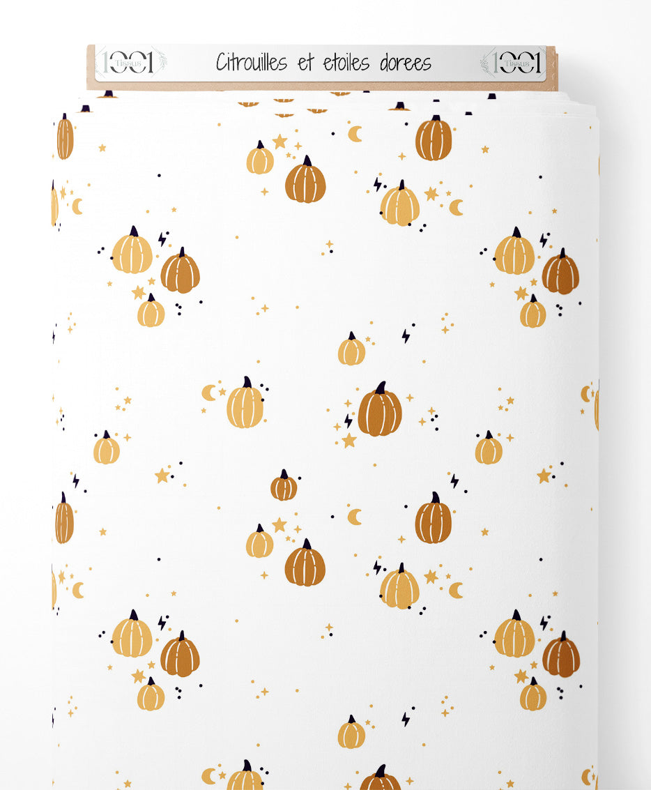 Les citrouilles sont de différentes tailles avec des détails noirs. Les étoiles dorées ajoutent une touche scintillante. Les lunes et éclairs noirs complètent le motif festif.Les tissus