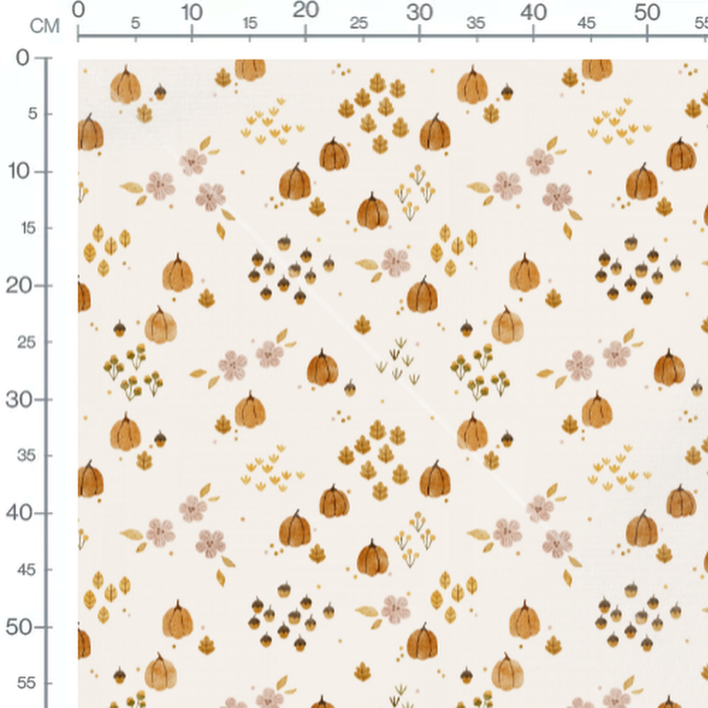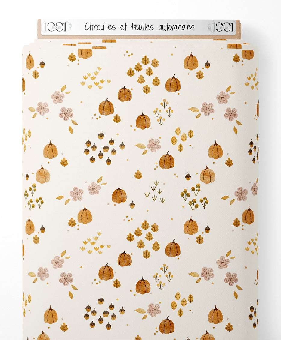 Les citrouilles sont de couleur marron clair. Les glands sont entourés de petites feuilles dorées. Des fleurs roses et des feuilles dorées ajoutent une touche de couleur. Le fond beige met en valeur les motifs automnaux.Les tissus