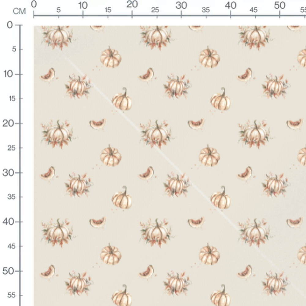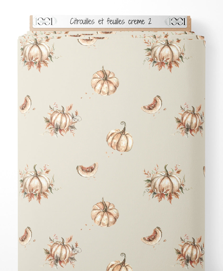 Les citrouilles sont accompagnées de feuilles d'automne dans des tons bruns et verts. Les tranches de citrouille ajoutent une touche rustique au motif. Le fond crème met en valeur les couleurs douces des éléments naturels.Les tissus
