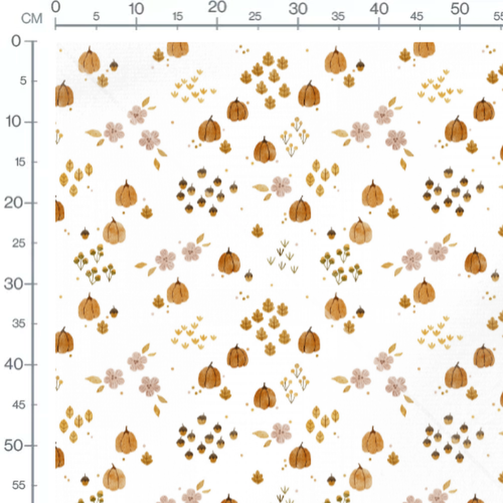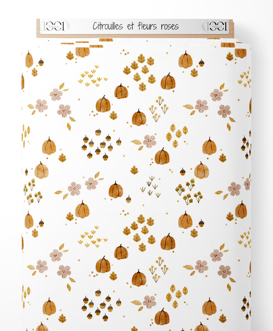 Petites fleurs roses accompagnées de feuilles brunes. Glands marron et citrouilles orange clair. Petites empreintes de feuilles dorées ajoutent un détail subtil.Les tissus
