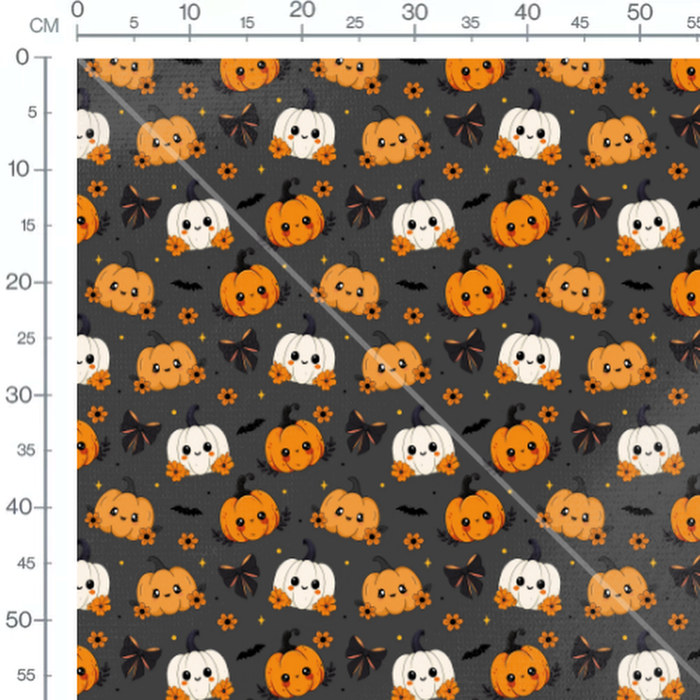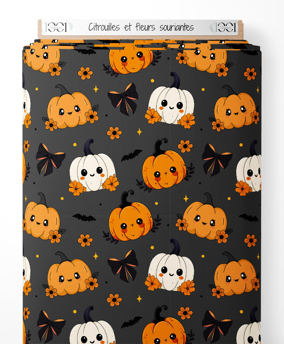 Petites chauves-souris noires et étoiles jaunes ajoutent une touche festive. Les citrouilles sont décorées de fleurs et de feuilles noires. Les nœuds noirs apportent un contraste élégant au motif.Les tissus