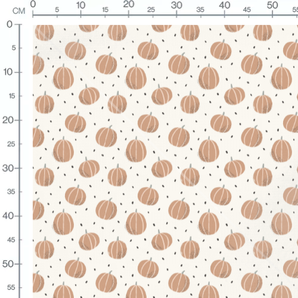 Les citrouilles sont de couleur marron clair avec des détails en lignes verticales. Le fond crème met en valeur les motifs automnaux. Les petits points noirs ajoutent un contraste subtil au design.Les tissus