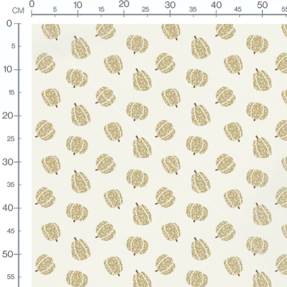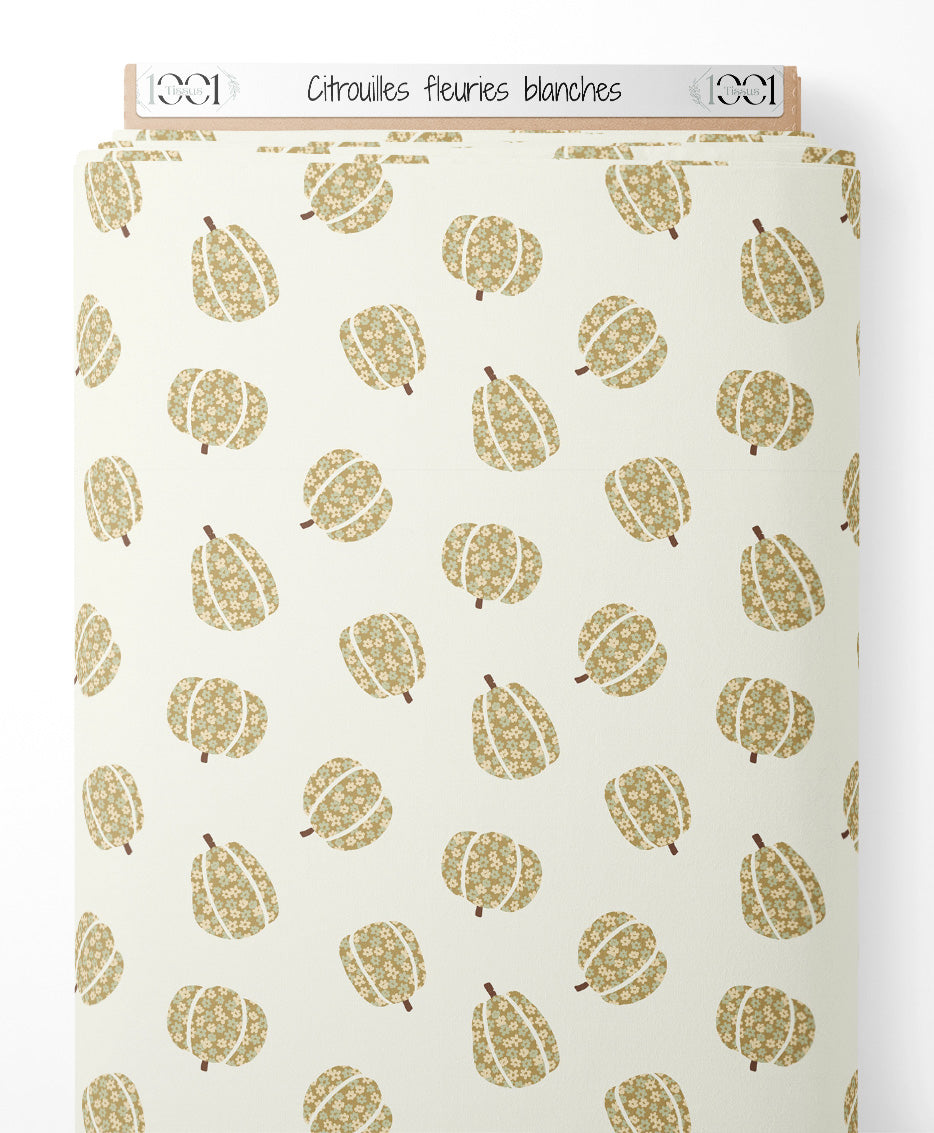 Les citrouilles sont décorées de petites fleurs beige et marron. Chaque citrouille présente un motif floral uniforme. Le fond blanc met en valeur les motifs floraux des citrouilles.Les tissus
