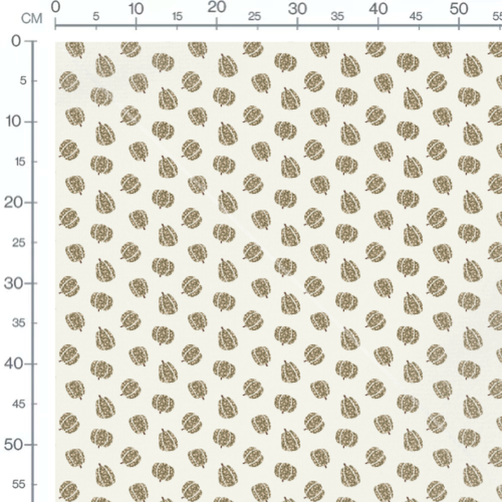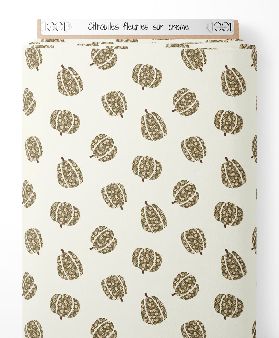 Les citrouilles présentent des motifs floraux détaillés. Les fleurs blanches contrastent avec le marron des citrouilles.Les tissus