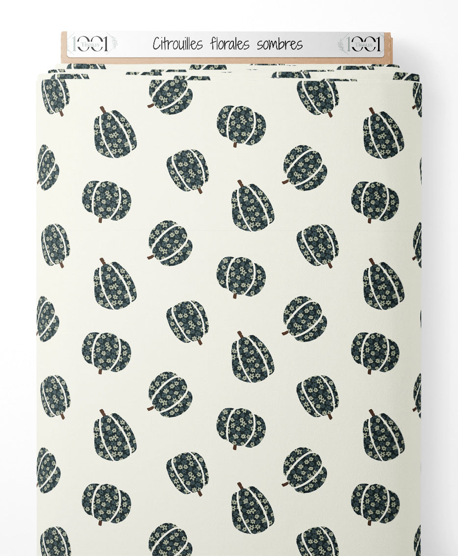 Les citrouilles sont de couleur sombre avec des motifs floraux détaillés. Les petites fleurs blanches contrastent avec le fond crème. Les tiges des citrouilles sont brunes.Les tissus