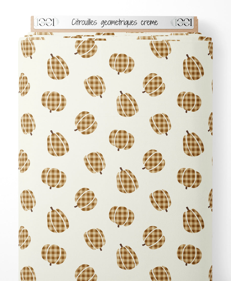 Les citrouilles sont décorées d'un motif à carreaux marron et beige. Le fond crème met en valeur les motifs géométriques des citrouilles. Les tiges ajoutent un contraste subtil avec leur couleur marron foncé.Les tissus