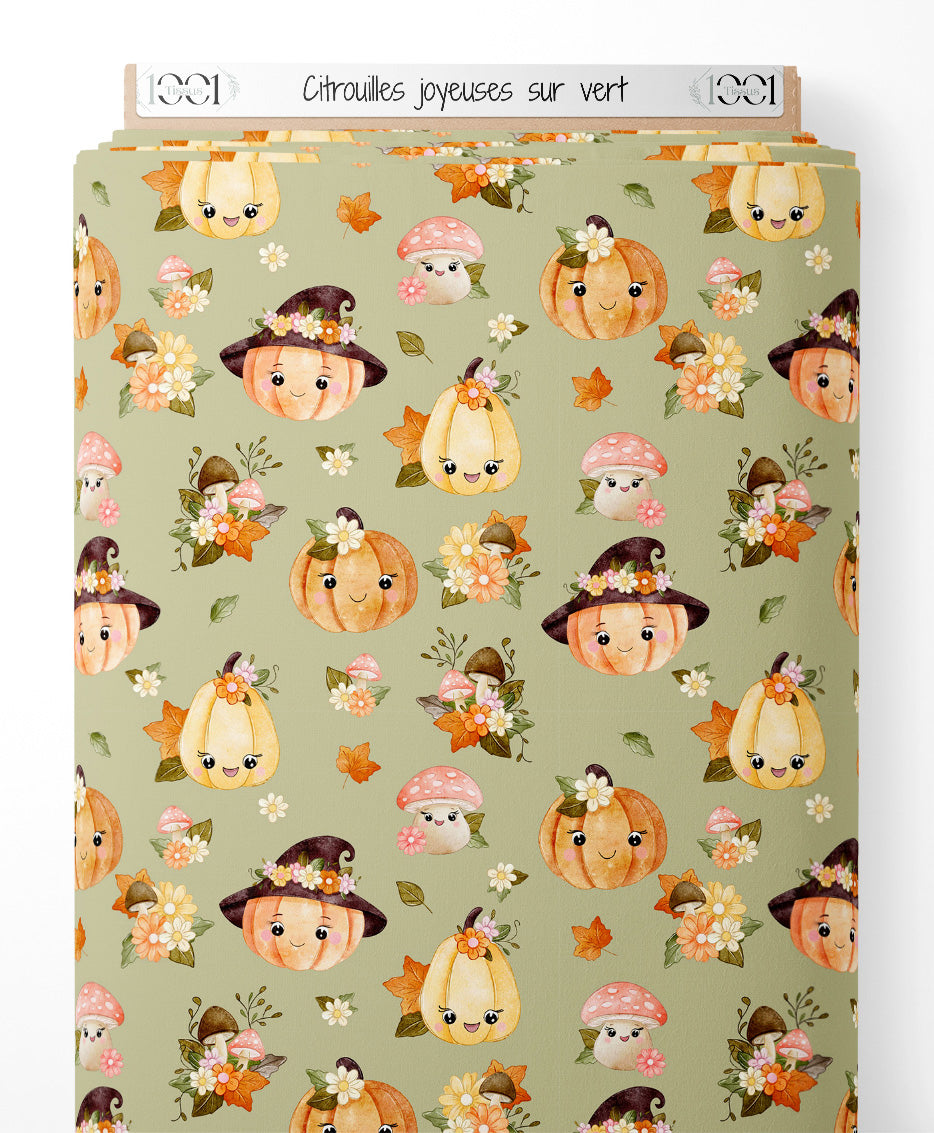 Les citrouilles portent des chapeaux ornés de fleurs blanches et oranges. Les champignons ont des têtes roses à pois blancs. Des feuilles d'érable orange et des petites fleurs blanches complètent le motif.Les tissus