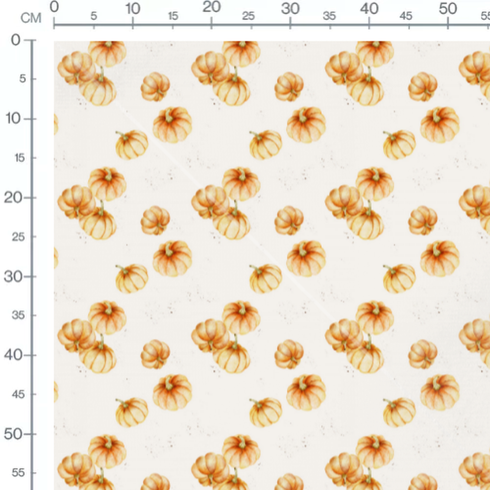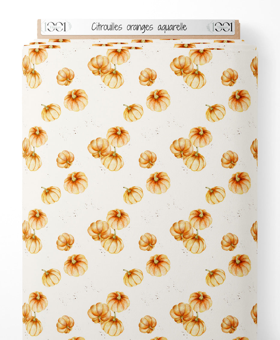 Les citrouilles sont de différentes tailles et nuances d'orange. Le fond blanc met en valeur les couleurs chaudes des citrouilles. Les taches noires ajoutent un léger contraste au motif.Les tissus