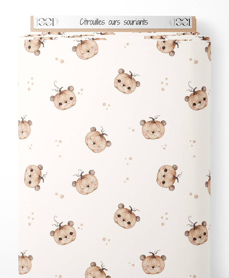 Les citrouilles ont des oreilles rondes et des visages souriants. De petites taches marron clair parsèment le fond blanc.Les tissus