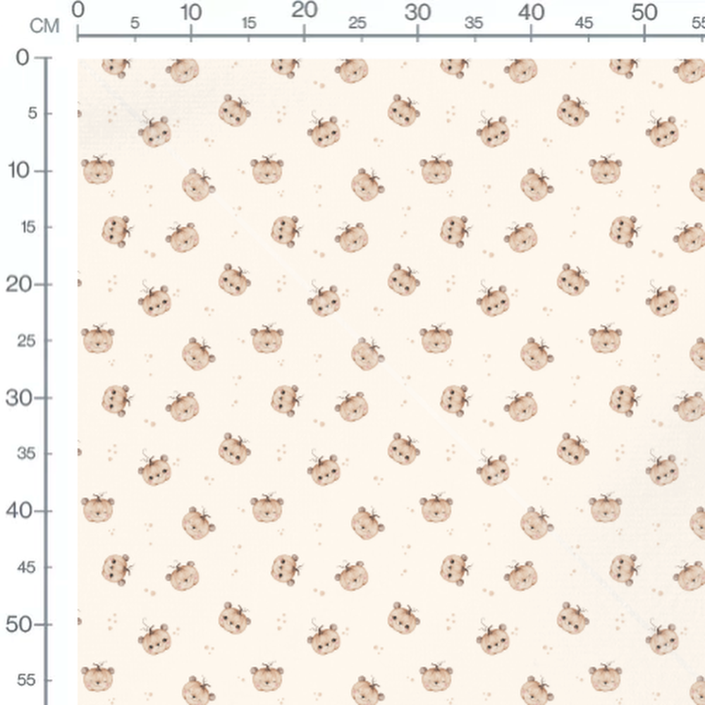 Les citrouilles ont des traits d'ours avec des oreilles rondes et des sourires doux. Les tiges sont délicatement dessinées, ajoutant une touche naturelle. De petites taches brunes parsèment le fond crème, créant un effet ludique.Les tissus