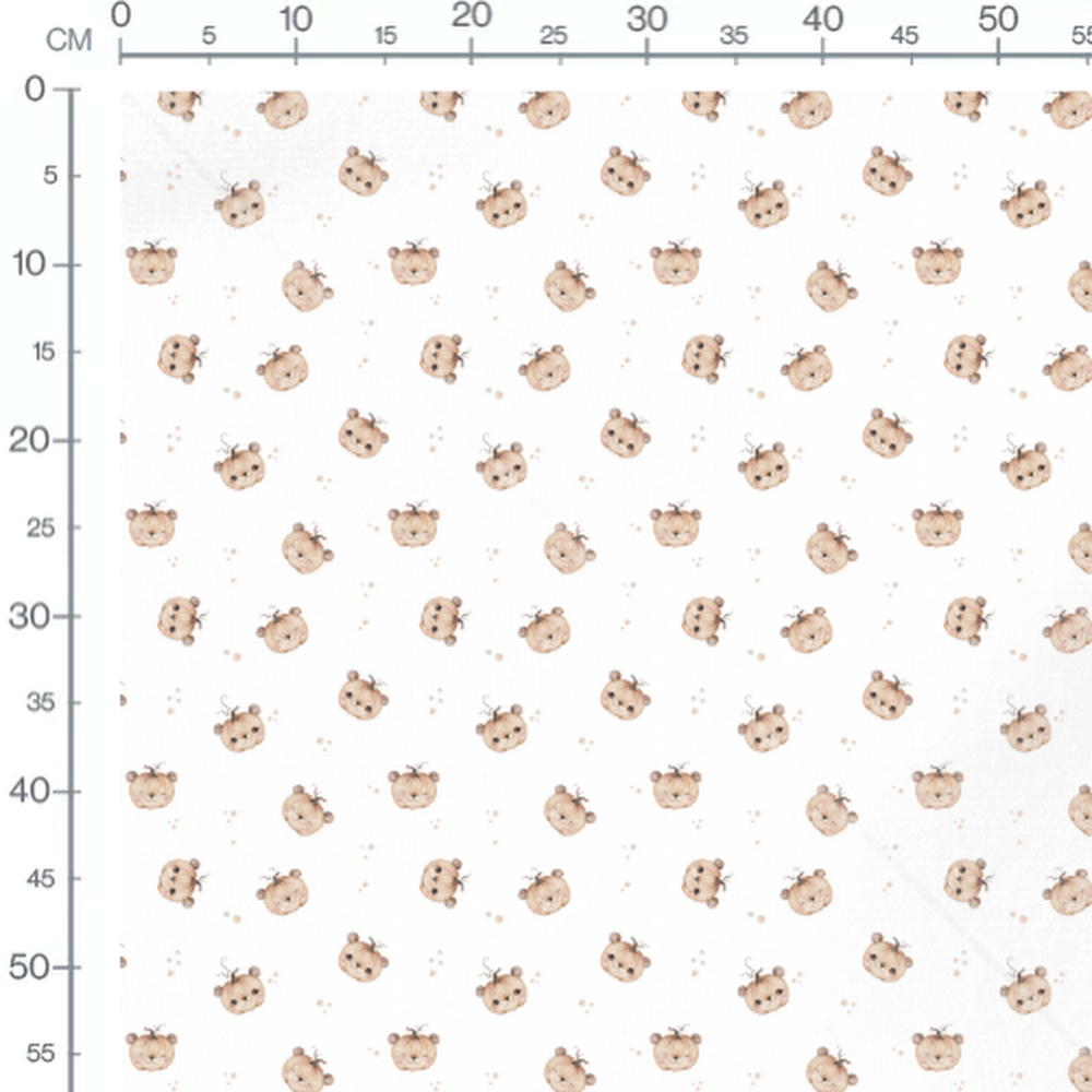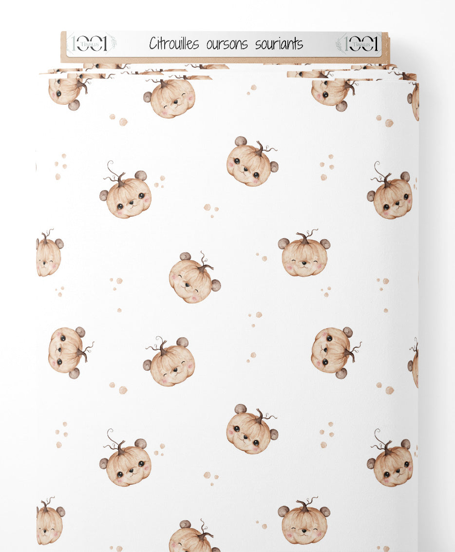 Les citrouilles ont des traits d'oursons avec des oreilles rondes et des visages souriants. Les petites taches beige ajoutent un effet ludique au motif.Les tissus