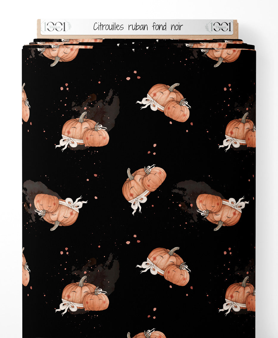 Les citrouilles sont ornées de rubans blancs délicats. Le fond noir est parsemé de petites taches roses et noires, ajoutant un effet de contraste.Les tissus