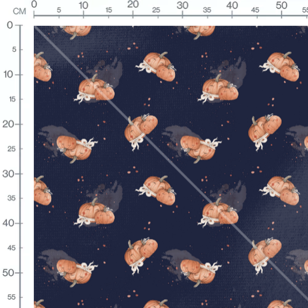 Les citrouilles sont ornées de rubans blancs délicats. Le fond bleu foncé est parsemé de petites taches roses et grises. Les citrouilles sont disposées de manière aléatoire sur le fond.Les tissus