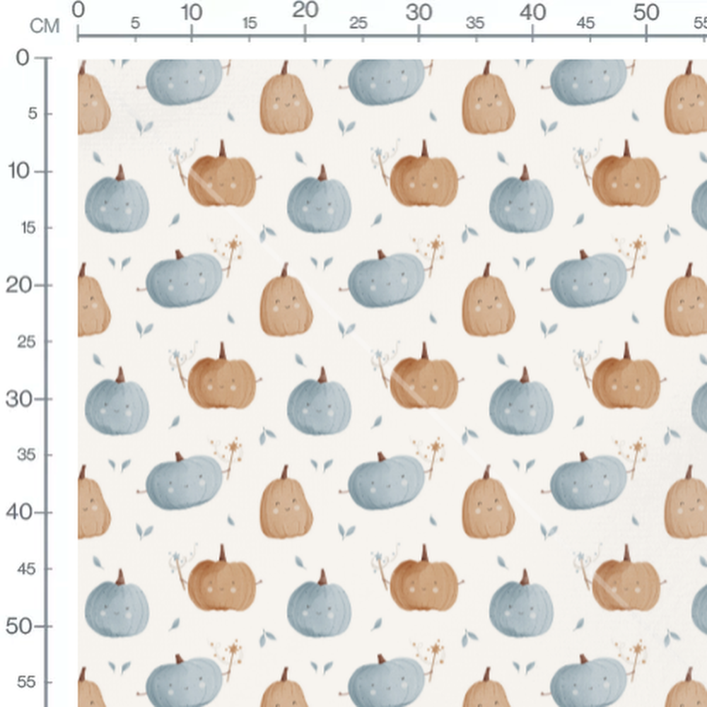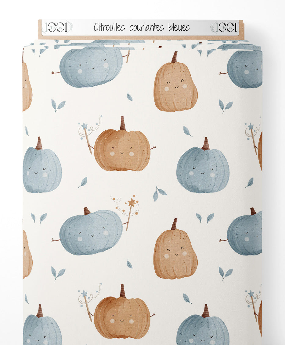 Les citrouilles portent des visages souriants et sont accompagnées de baguettes magiques. Les feuilles ajoutent une touche délicate au motif.Les tissus