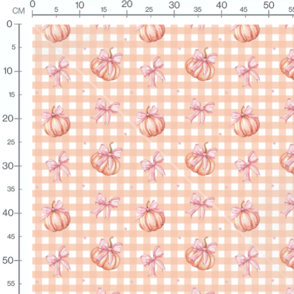 Les citrouilles sont ornées de nœuds roses à pois. Le motif inclut des petits points roses dispersés.Les tissus