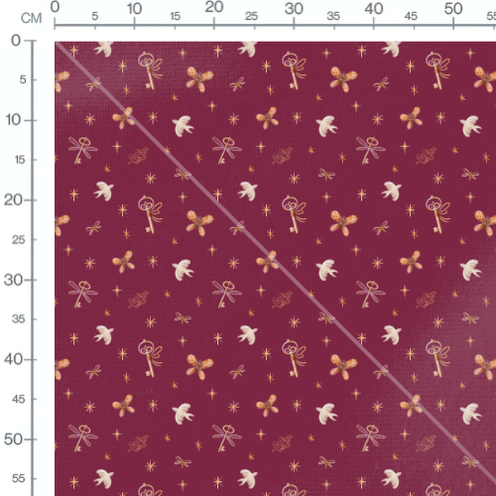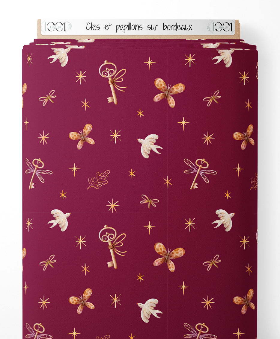 Les clés dorées sont ornées de rubans. Les papillons ont des ailes tachetées de nuances dorées. Des étoiles dorées ajoutent une touche scintillante. Des feuilles dorées complètent le motif.Les tissus