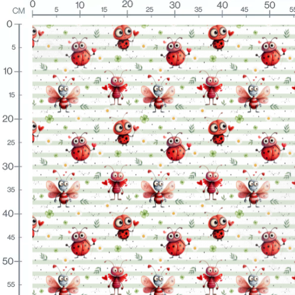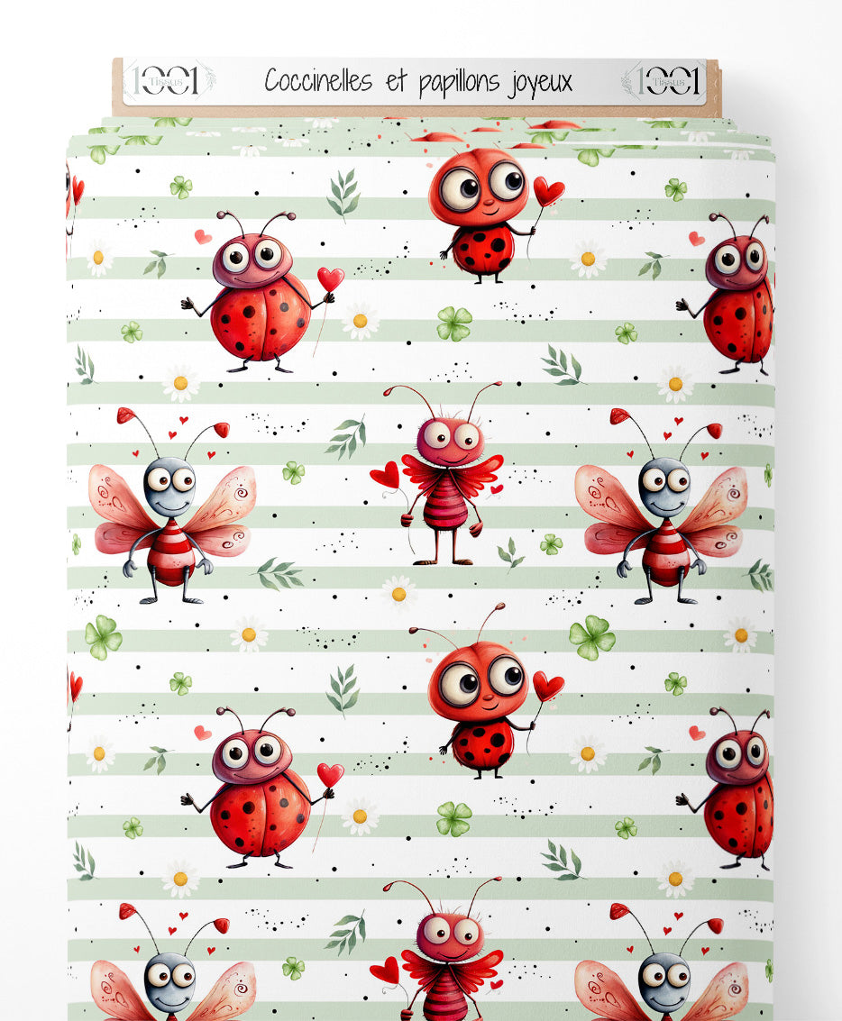 Les coccinelles tiennent des cœurs rouges. Les papillons ont des ailes décorées de motifs délicats. Des petites fleurs jaunes et blanches ajoutent une touche de couleur. Des feuilles vertes et des trèfles complètent le motif.Les tissus