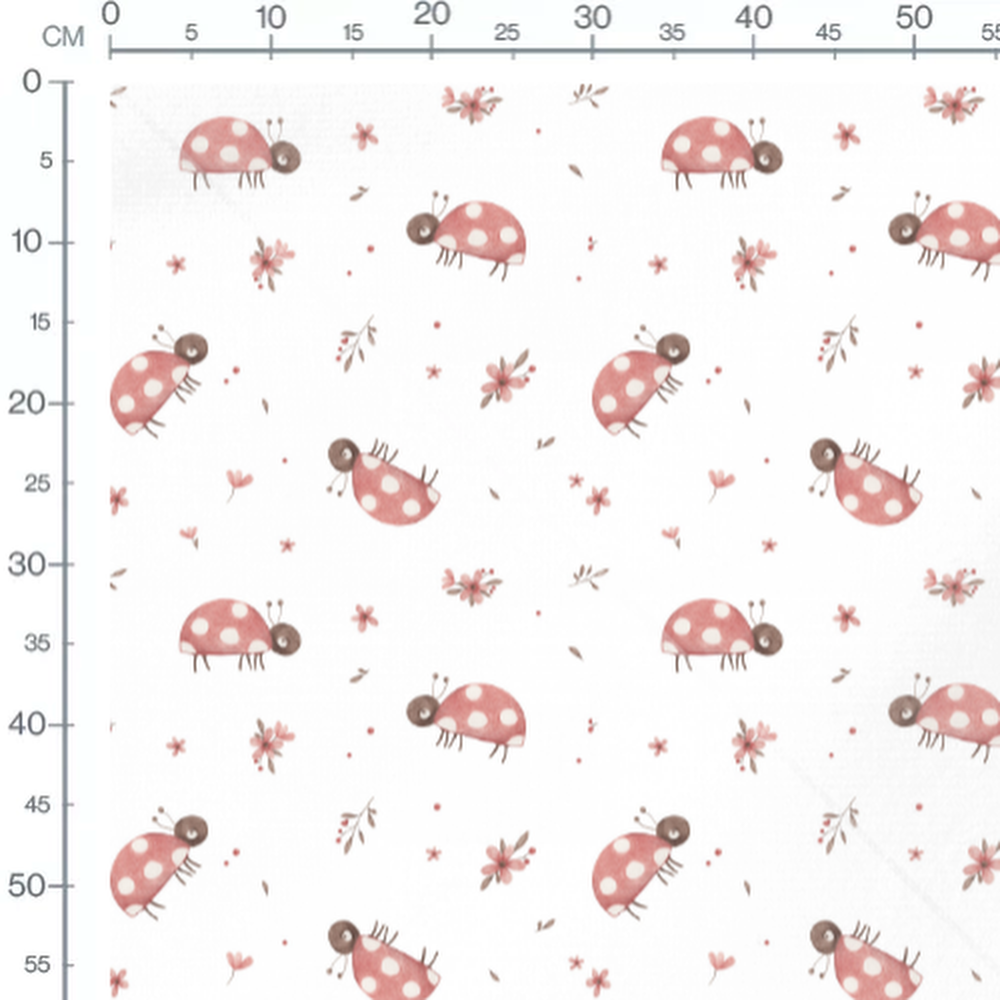 Les coccinelles ont des antennes et des pattes fines. Les fleurs sont de différentes tailles avec des pétales délicats. Les feuilles brunes ajoutent un contraste subtil au motif.Les tissus