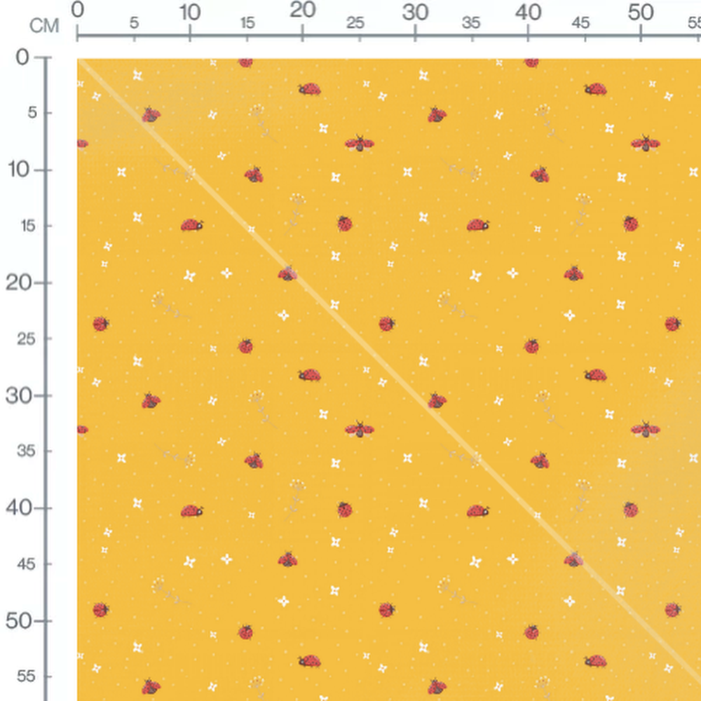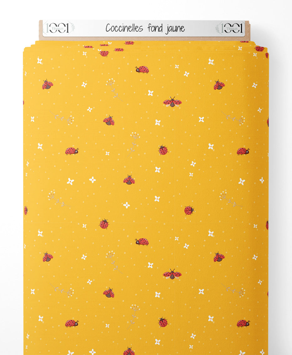 Les coccinelles sont accompagnées de petites fleurs blanches et de motifs floraux délicats. Le fond jaune vif met en valeur les couleurs des coccinelles et des fleurs. Les motifs sont répartis uniformément sur l'ensemble du tissu.Les tissus