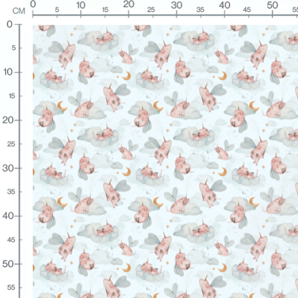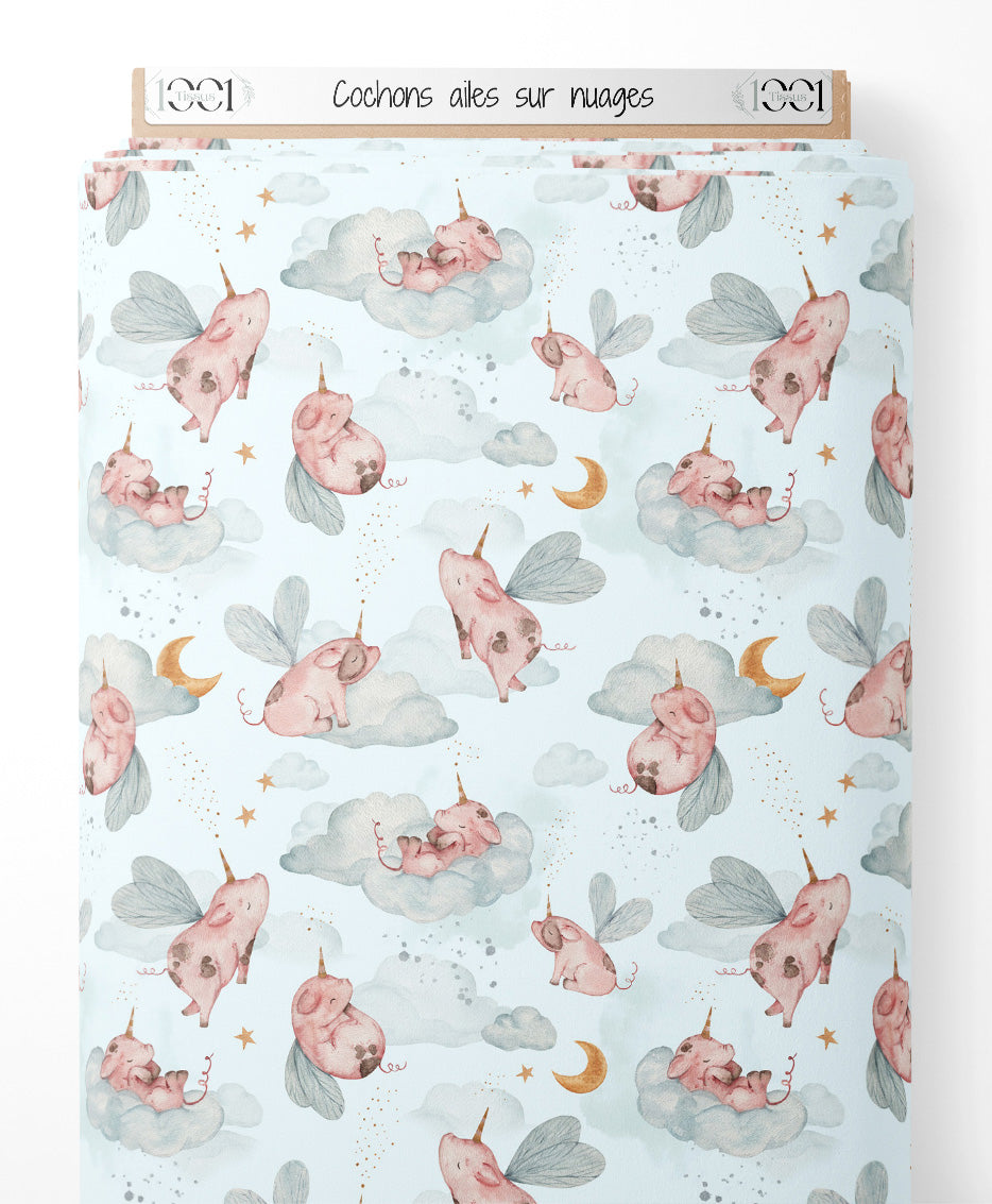 Les cochons portent des cornes de licorne et sont entourés de petites étoiles. Des croissants de lune dorés ajoutent une touche magique au motif.Les tissus