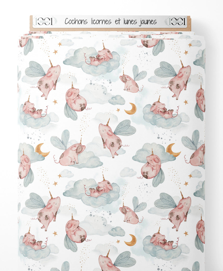 Les cochons licornes portent des ailes bleues et des cornes dorées. Les nuages sont doux et vaporeux, ajoutant une touche de rêve. Les étoiles et lunes apportent une ambiance céleste. Les nuances de rose et de bleu dominent le motif.Les tissus