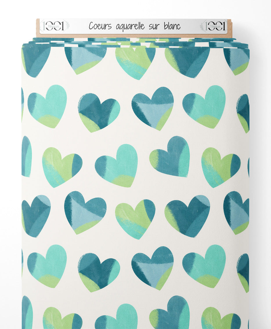 Les cœurs présentent des teintes de bleu et de vert. Chaque cœur a un effet aquarelle avec des variations de couleurs douces.Les tissus