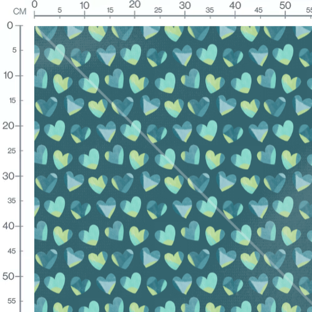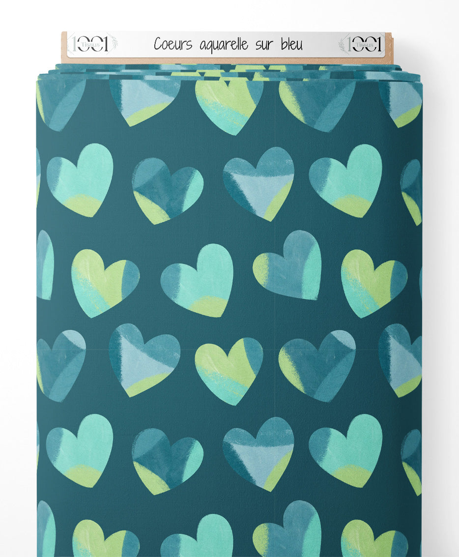 Les cœurs présentent des variations de teintes aquarelles. Les nuances incluent des tons de bleu clair et de vert pastel. Le fond bleu foncé met en valeur les cœurs colorés.Les tissus