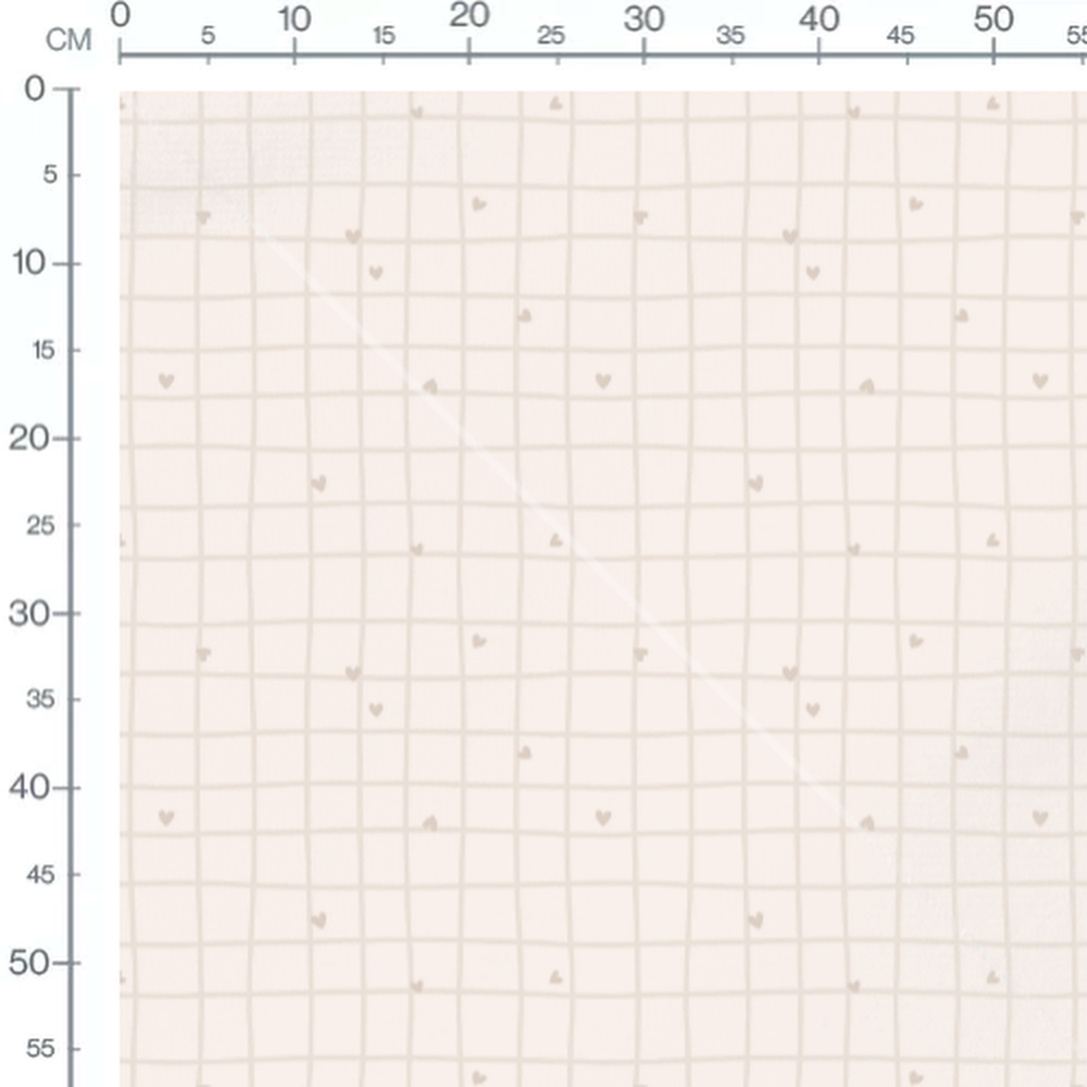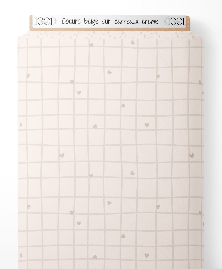 Les cœurs sont dispersés de manière aléatoire sur le motif. La grille beige crée un motif géométrique subtil.Les tissus