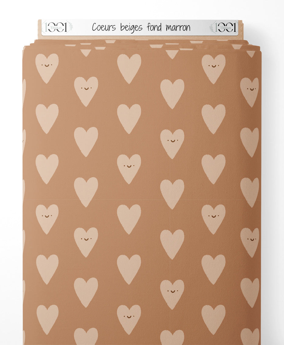 Les cœurs présentent de petits visages souriants. Le fond marron met en valeur les cœurs beiges.Les tissus