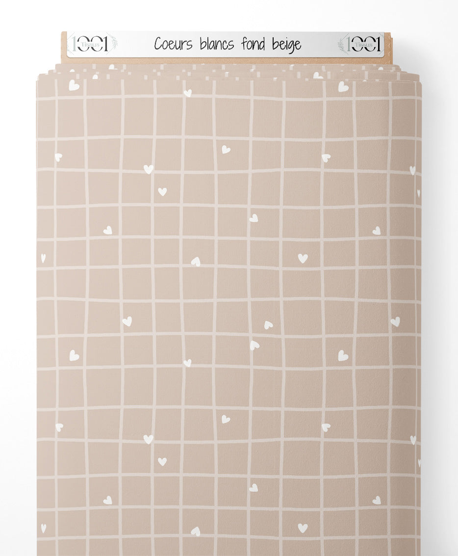 Petits cœurs blancs sur fond beige. Grille de carreaux blancs sur fond beige.Les tissus