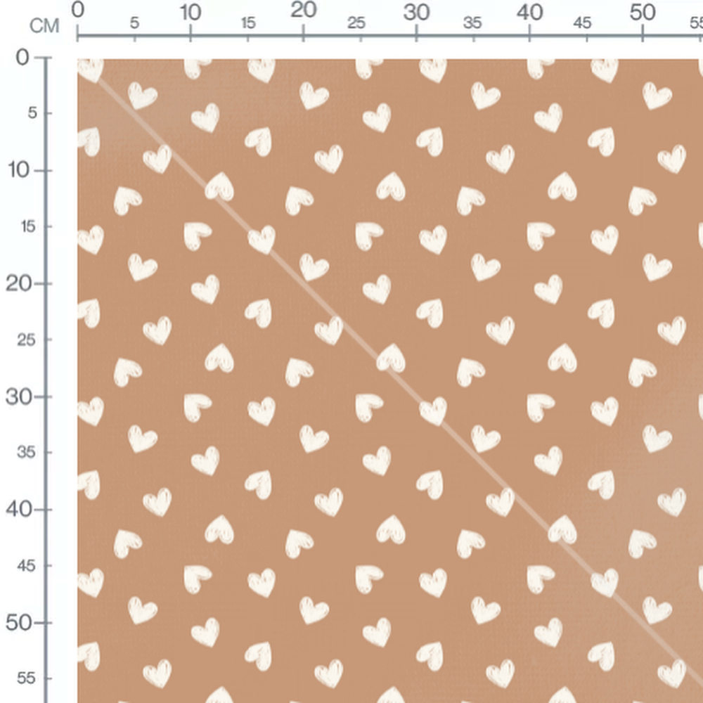 Les cœurs sont dessinés de manière esquissée avec un contour irrégulier. Le fond brun met en valeur la simplicité des cœurs blancs.Les tissus
