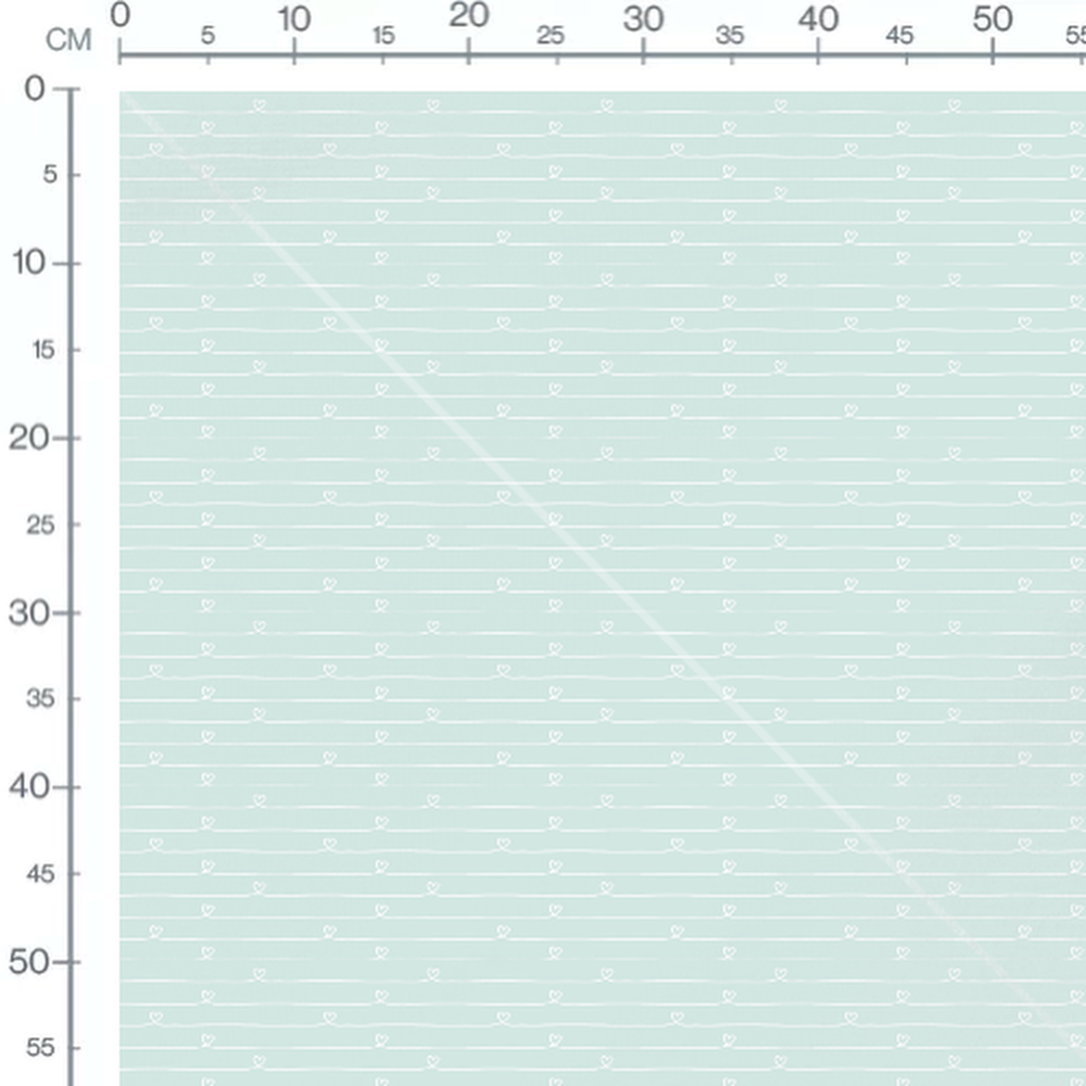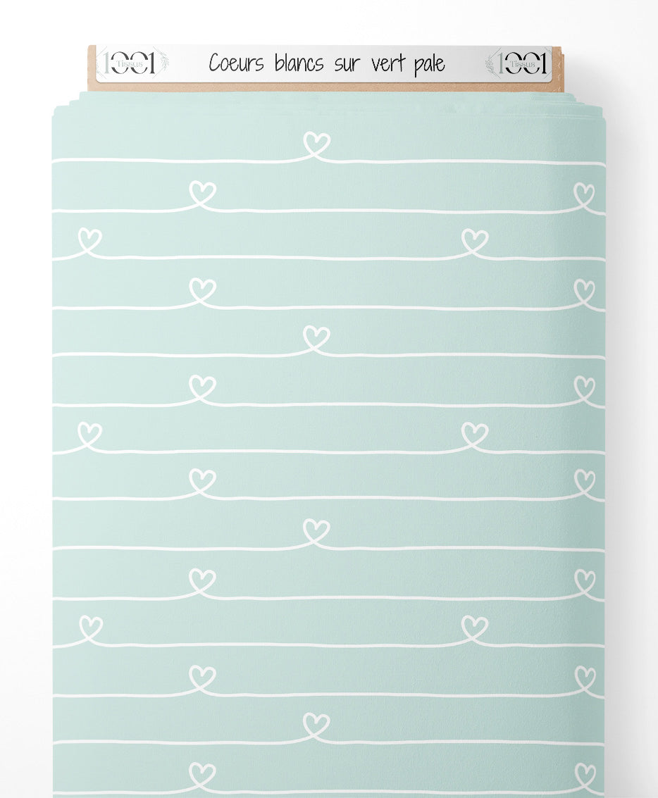 Les cœurs sont régulièrement espacés le long des lignes. Le fond vert pâle ajoute une touche douce et apaisante. Les lignes blanches sont fines et continues.Les tissus