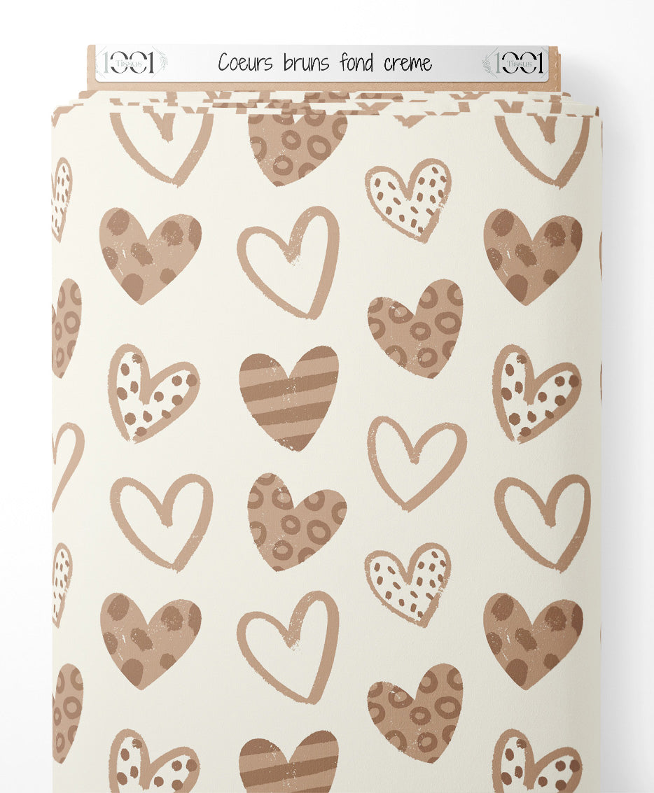 Les cœurs présentent des motifs de rayures et de pois. Les couleurs varient entre différentes teintes de brun. Le fond crème met en valeur les motifs des cœurs.Les tissus