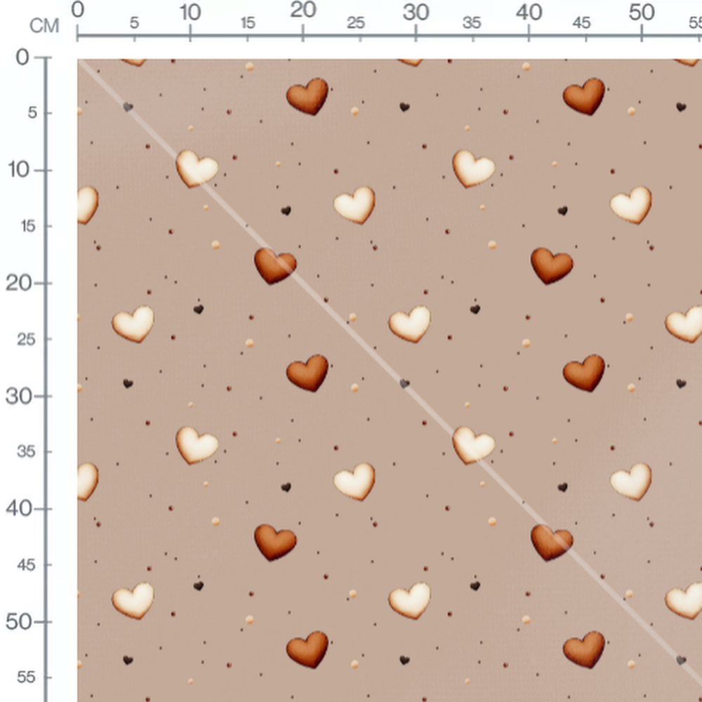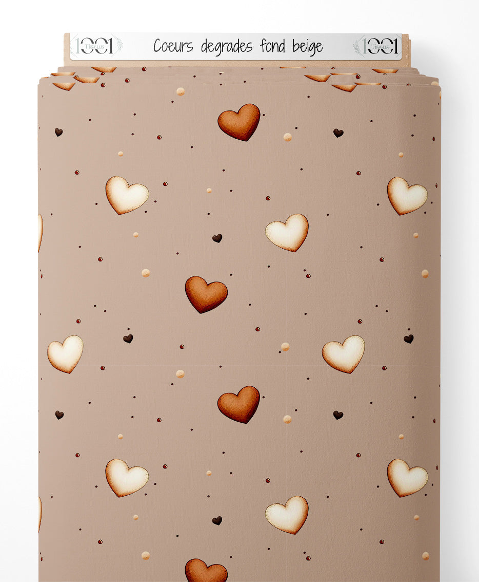Les cœurs varient du marron foncé au crème. Les points ajoutent une touche de contraste au fond beige.Les tissus