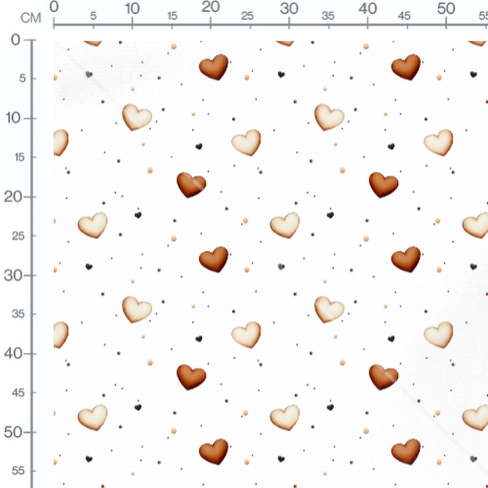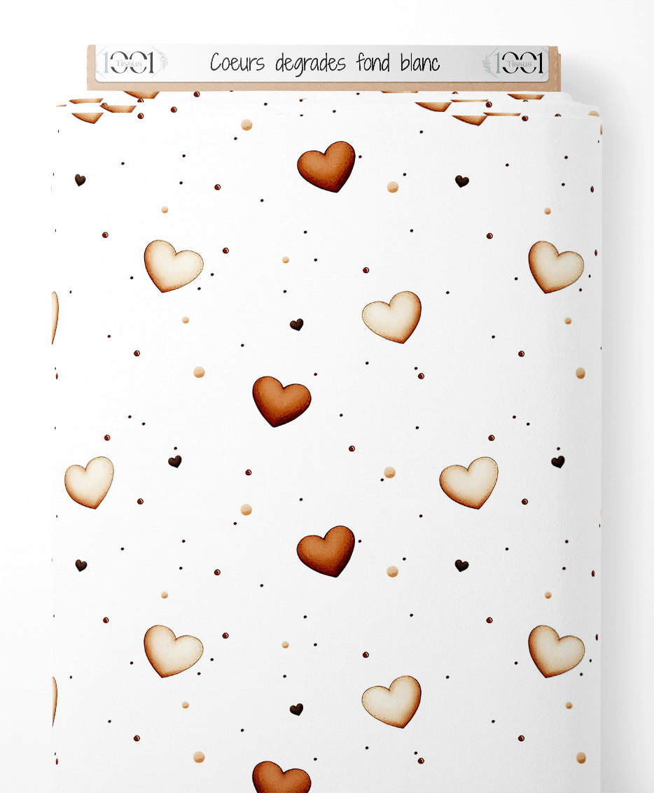 Les cœurs varient en taille et en teinte, allant du marron foncé au beige clair. Les points ajoutent une texture subtile et contrastent avec le fond blanc.Les tissus