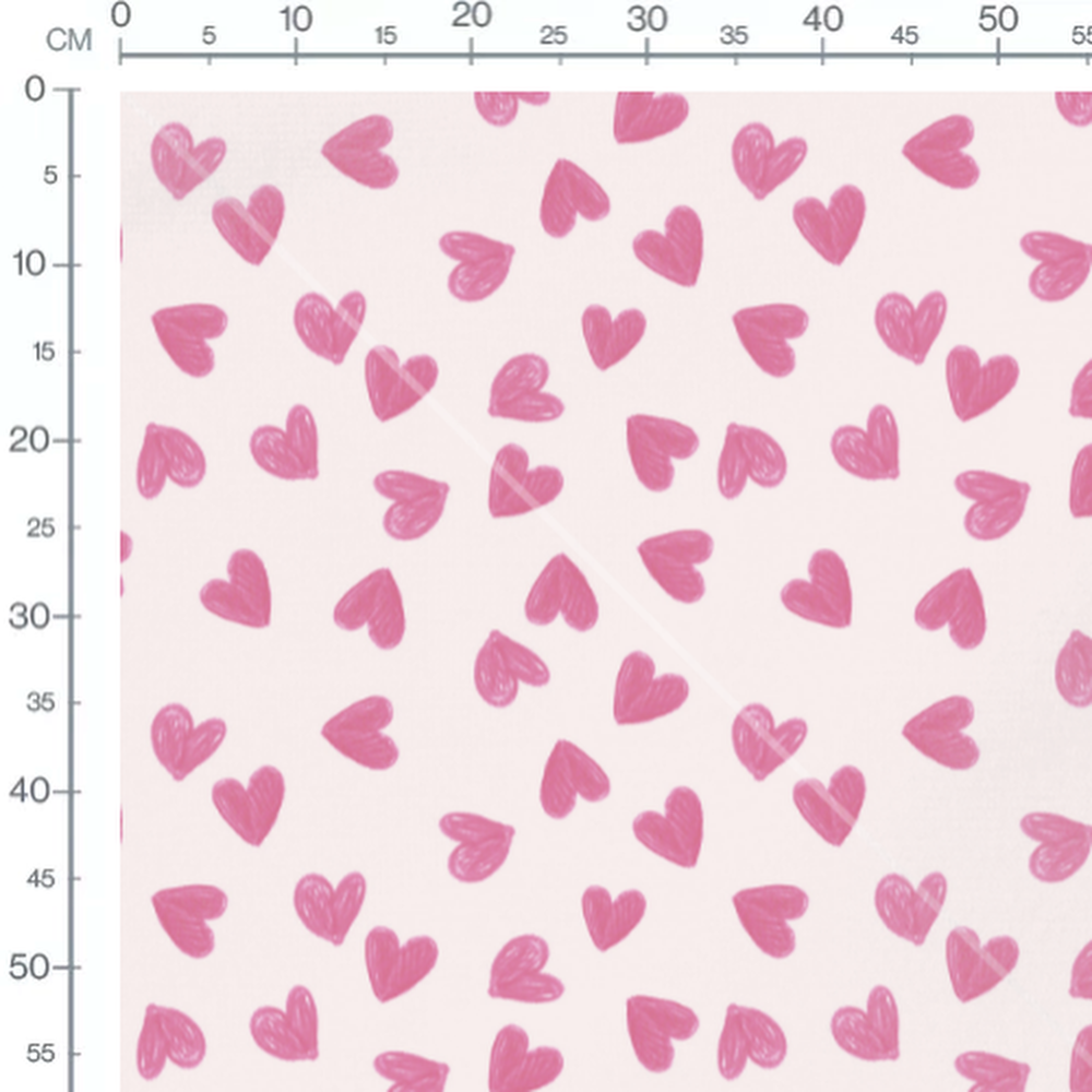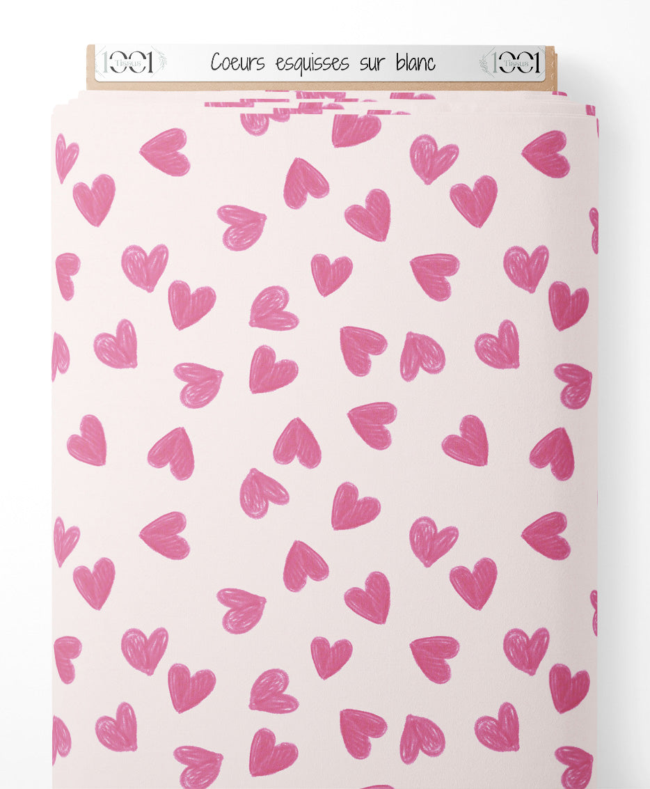 Les cœurs sont de couleur rose vif et semblent dessinés à la main. Le fond blanc met en valeur le motif simple et charmant des cœurs.Les tissus