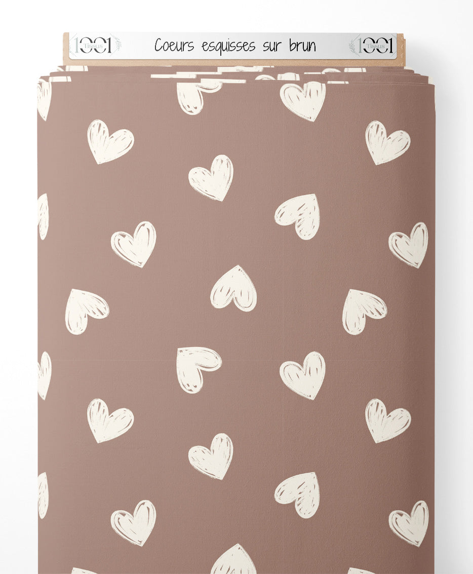 Les cœurs sont esquissés avec des traits irréguliers. Le fond brun offre un contraste doux avec les cœurs blancs.Les tissus