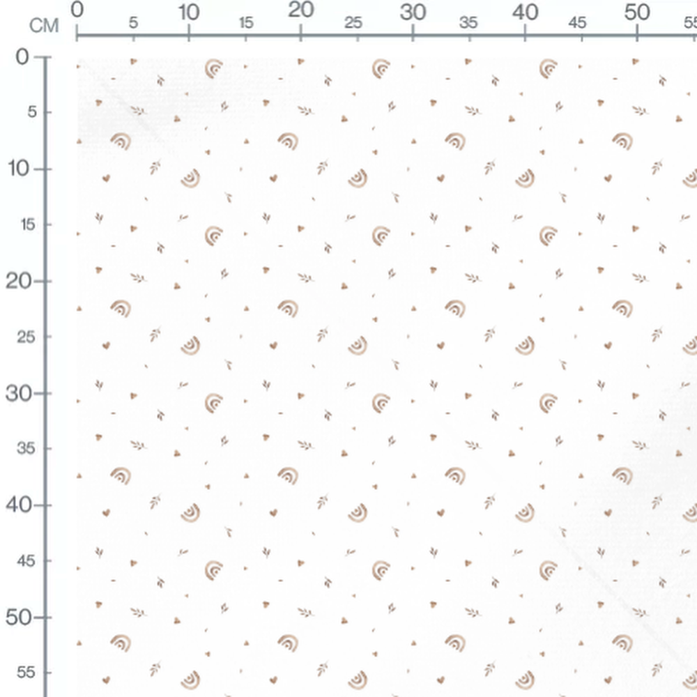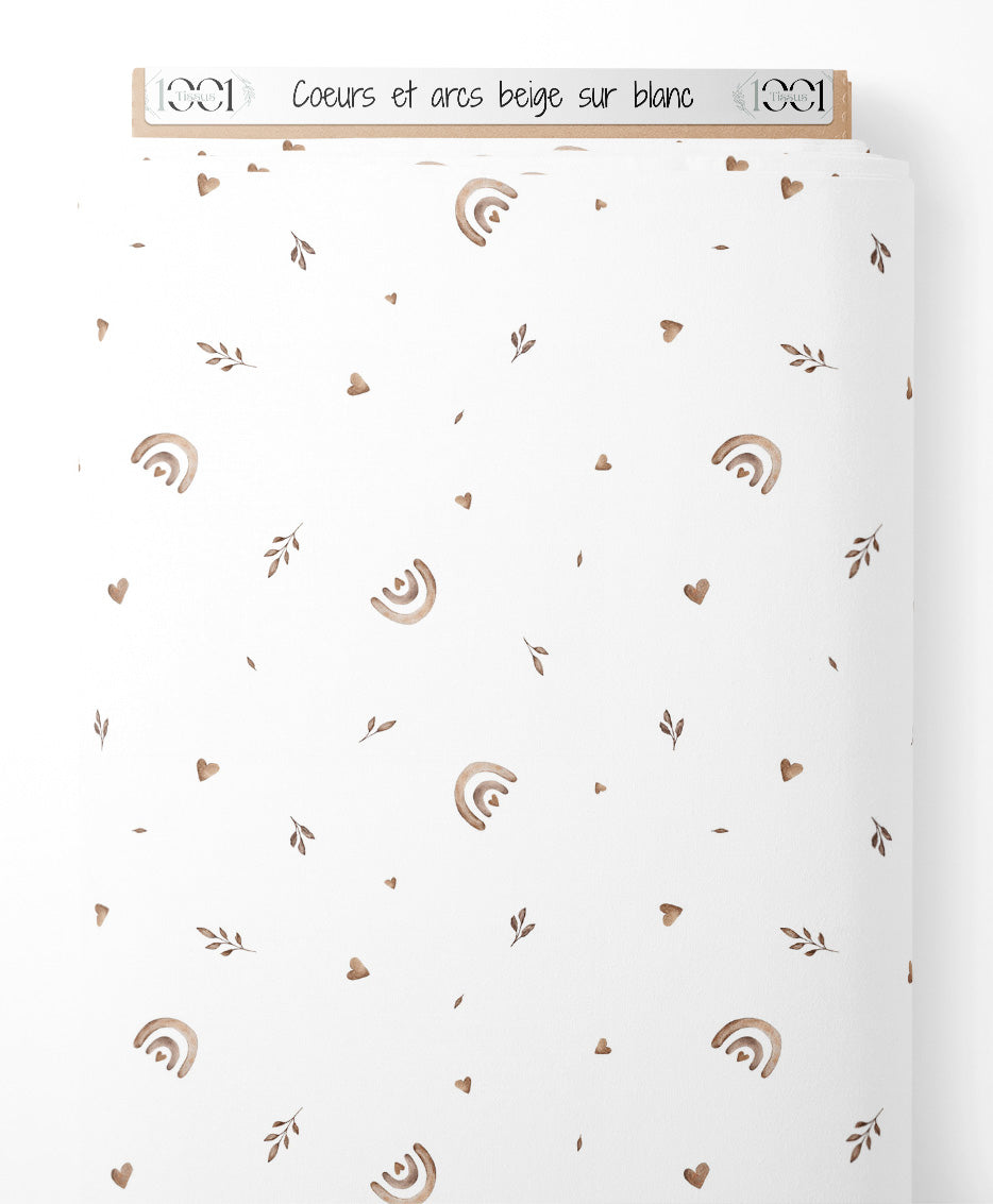 Les motifs incluent des cœurs et des arcs de couleur beige. De petites feuilles beige ajoutent une touche naturelle. Le fond blanc met en valeur la simplicité des motifs.Les tissus