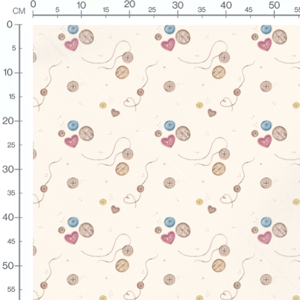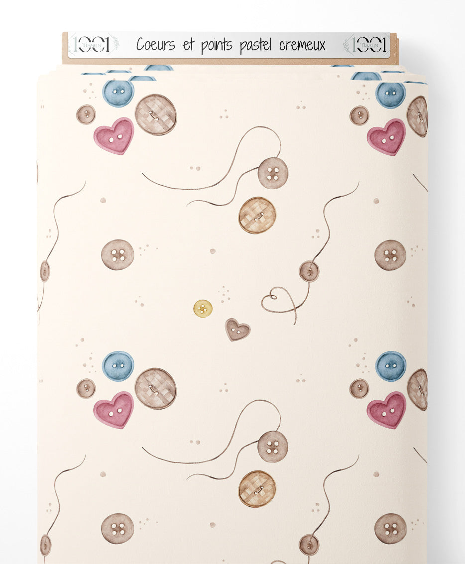 Les boutons sont de différentes tailles et couleurs, incluant du bleu, rose, jaune et beige. Les fils noirs serpentent entre les boutons, ajoutant un effet dynamique. Les cœurs apportent une touche douce et ludique au motif. De petits points pastel complètent le design, créant une ambiance harmonieuse.Les tissus